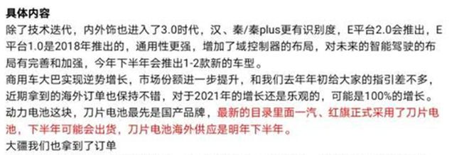 此外,根据网络曝光的一张疑似比亚迪电话会议纪要内容的图片显示,比亚迪将从2021年下半年开始向红旗提供“刀片电池”,与工信部显示的申报信息不谋而合。