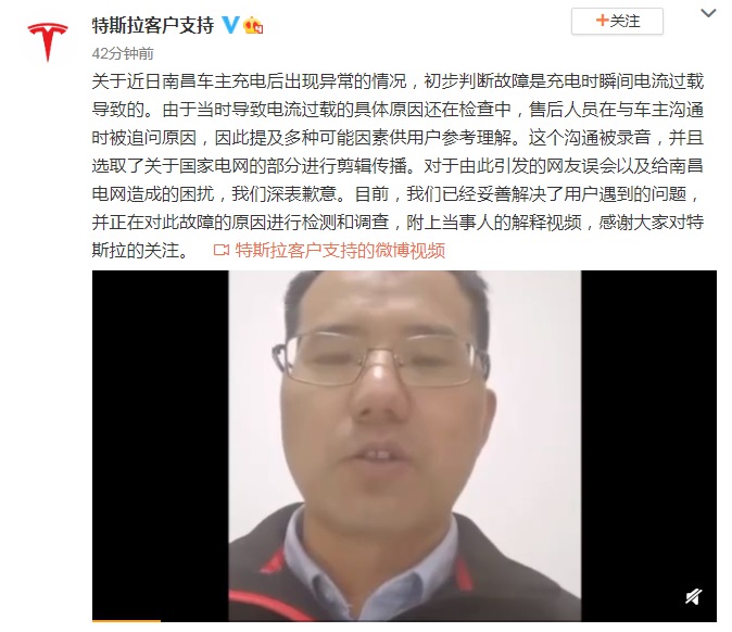 特斯拉称,对于由此引发的网友误会以及给南昌电网造成的困扰,我们深表歉意。目前,我们已经妥善解决了用户遇到的问题,并正在对此故障的原因进行检测和调查,附上当事人的解释视频,感谢大家对特斯拉的关注。