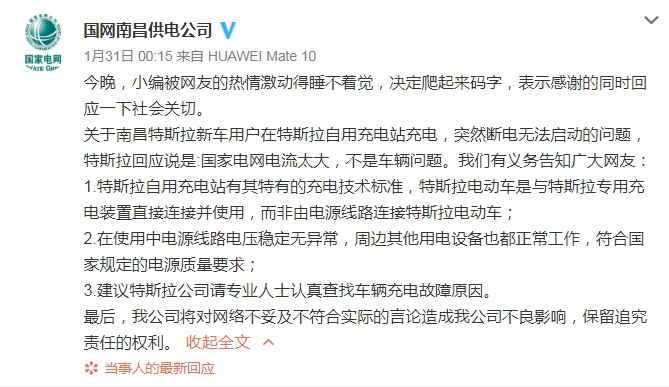 面对特斯拉的“甩锅”,1月31日凌晨,国网江西省电力有限公司南昌供电分公司官方微博发文称: