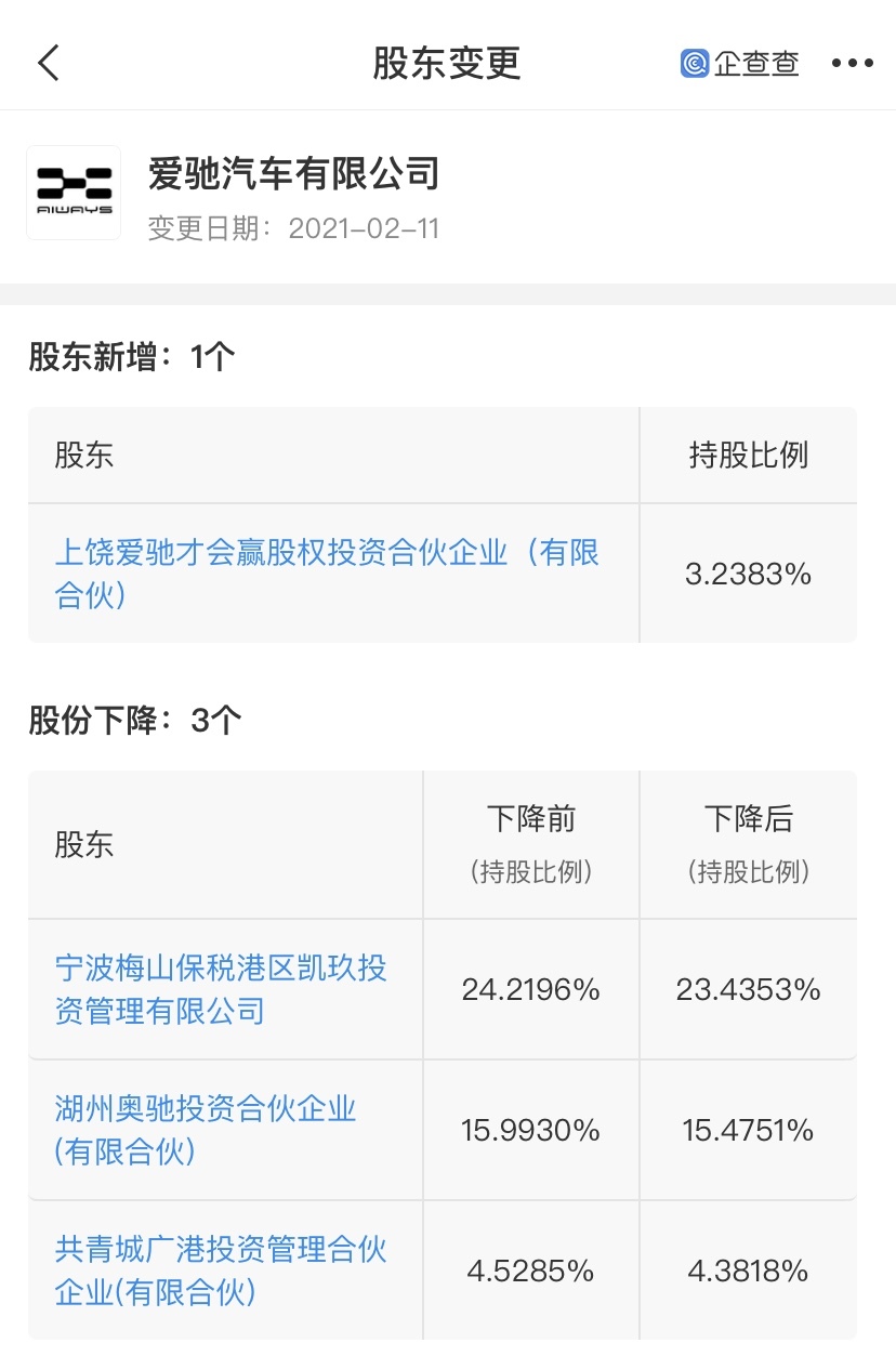 根据公开资料,爱驰汽车新增股东为上饶爱驰才会赢股权投资合伙企业(有限合伙),持股3.24%。与此同时,该公司注册资本由82868.97万元,增加至85642.36万元,增加了3.35%。