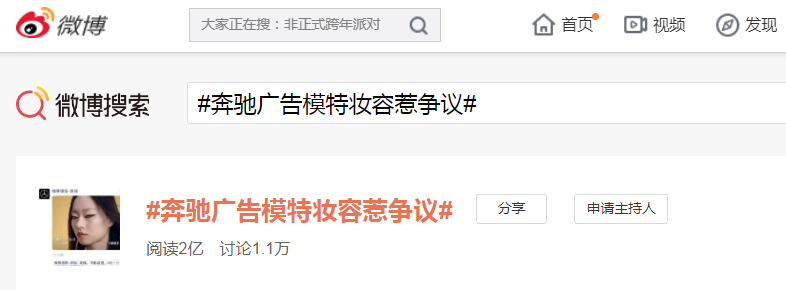 12月28日,“奔驰广告模特妆容惹争议”登上微博热搜,引发网友热议。