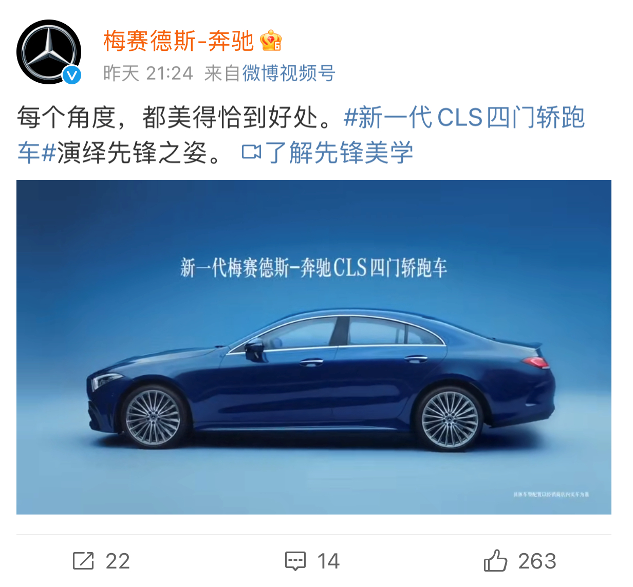 中新经纬28日晚间查看梅赛德斯-奔驰微博账号发现,12月25日发布的涉事微博及视频已不存在。仅有12月27日新发布的一则“新一代CLS四门轿跑车”广告宣传视频,时长仅15秒,且无模特出镜。