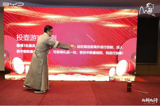 恰逢岁末年初,比亚迪汽车还为各位嘉宾准备了满满的惊喜,大家身着古装,体验了中国传统的投壶游戏,欢乐笑声high翻全场。