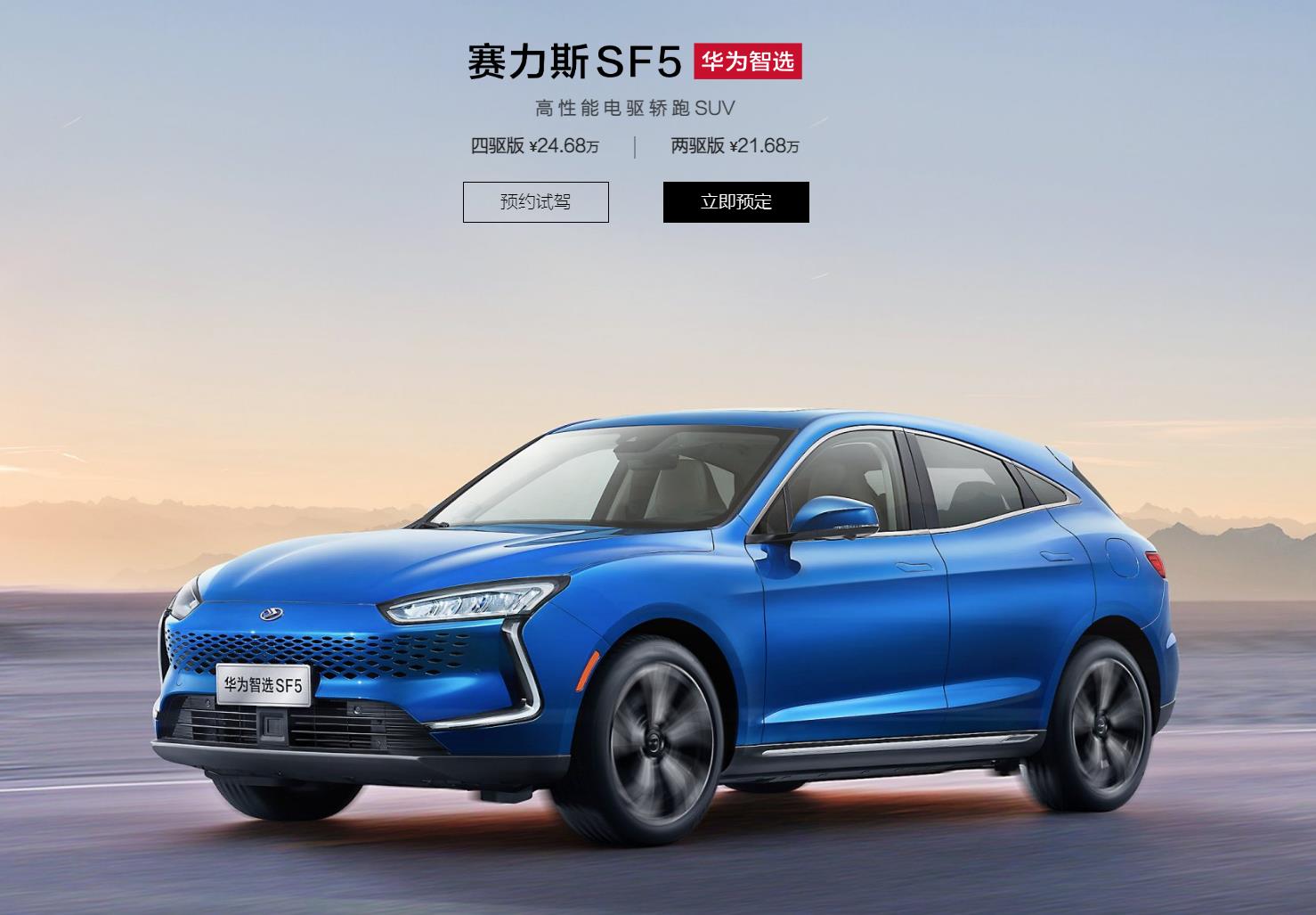 赛力斯华为智选SF5是华为与小康股份合作的第一款车型,2021年4月21日起开启预订。官网介绍,其为高性能电驱轿跑SUV,四驱版价格为24.68万元,两驱版价格为21.68万元。