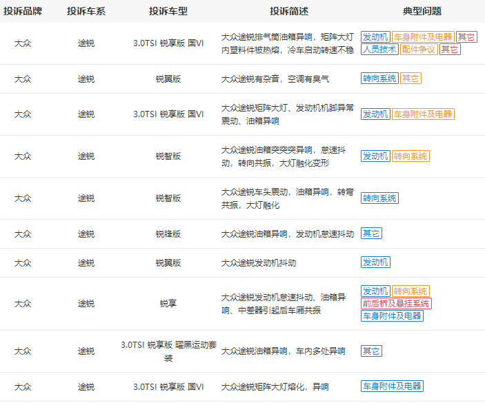 进口大众步入了“进退两难”的困局,而更让其难堪的是,“独苗”途锐近日在中国网汽车质量投诉平台上也被爆出了大量投诉案例,包括机脚垫老化的发动机怠速抖动、中央差速器的异响以及车辆油箱的异响等“通病”问题。