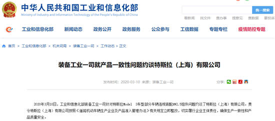 昨日,工业和信息化部装备工业一司针对特斯拉Model 3车型部分车辆违规装配HW2.5组件问题约谈了特斯拉(上海)有限公司(以下简称“特斯拉”)。责令特斯拉按照《道路机动车辆生产企业及产品准入管理办法》有关规定立即整改,切实履行企业主体责任,确保生产一致性和产品质量安全。
