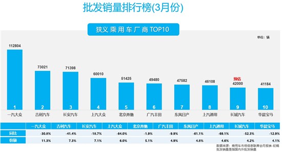 分不同级别市场来看,受换购市场兴旺推动,高档品牌表现依旧突出,3月,高档品牌销量同比“仅”下滑20%;尤其以批发量来看,北京奔驰高居厂商批发量第5名,华晨宝马同样挤进前十,体现出了厂家、经销商对后市的绝对信心。主流合资品牌中,德系品牌份额扩大4.4%,而日系品牌则下滑1.9%。