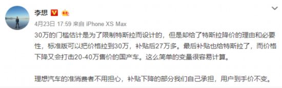 理想汽车CEO李想在微博中直言,“30万元的门槛估计是为了限制特斯拉而设计的,但是却给了特斯拉降价的理由和必要性。” 小鹏汽车董事长何小鹏亦预判,“年内Model3长续航版会降价到27.75万”。
