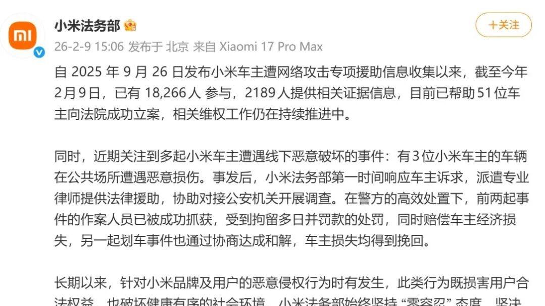 3位小米车主的车辆在公共场所遭遇恶意损伤,小米法务部披露详情