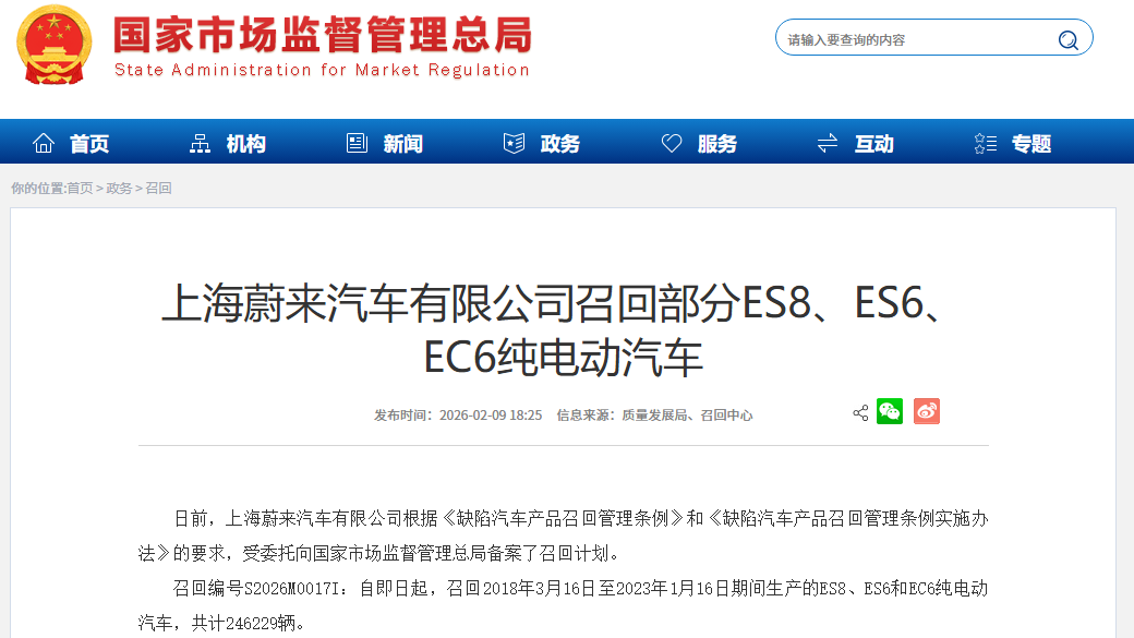 因软件问题存在安全隐患,蔚来召回部分ES8、ES6、EC6纯电动汽车