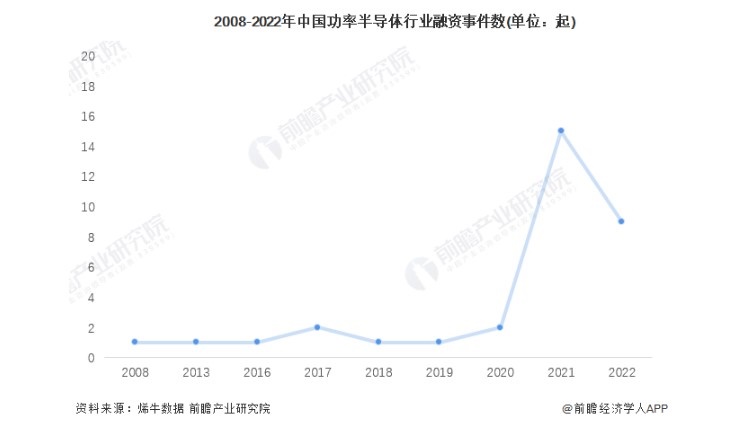 2021年,功率半导体行业受资本青睐度陡增,融资热度高涨,共发生融资事件15起。2022年上半年,中国功率半导体行业融资热情依旧,1-5月,融资事件达到9起。