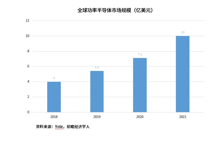 知名半导体分析机构Yole的数据显示,2019年全球碳化硅功率器件市场规模为5.4亿美元;2020年增长到7.1亿美元,增长率达31%;2021年的规模更是增长41%,突破了10亿美元。