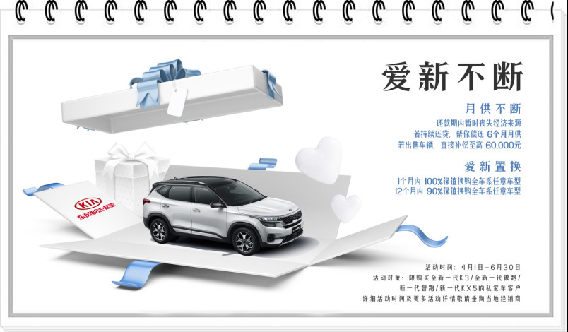 “爱新置换”则指客户在活动期间购买指定车型,在一个月内有置换需求,并且确认换购东风悦达起亚全车系任意车型,可以享受旧车以开票价原价回购的服务。与此同时,如客户在购车一年内有置换东风悦达起亚全车系任意车型的需求,旧车可按购车时9折开票价回购。该计划在确保客户车辆保值率的同时,赋予他们一直“开新车”的“爱新”权益。