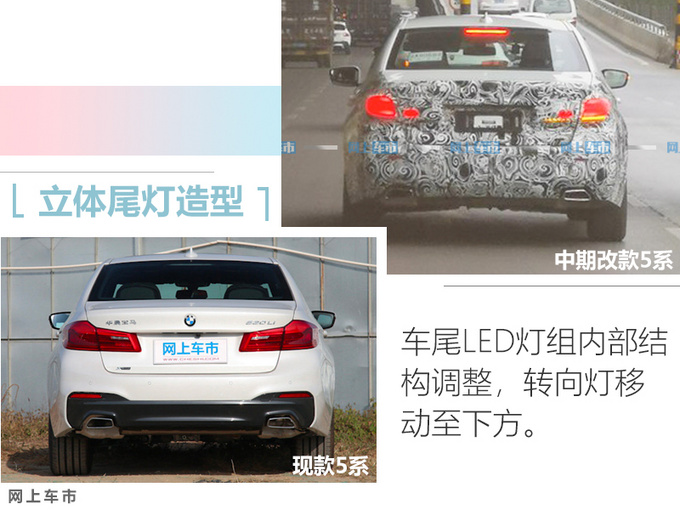 中期改款5系的外观变化主要集中在车头和车尾部分,车身侧面与现款基本保持一致,预计会对选装全新造型的轮毂。新车前脸将会换装更大尺寸的连体式双肾格栅,两侧的“天使眼”大灯内部结构也进行了调整,第一眼看过去甚至有捷豹XJ的影子。尾部LED灯组造型更加立体,排气则沿用双边双出式布局。内饰方面,整体设计与现款车型基本保持一致。