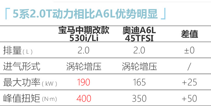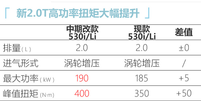 作为中期改款车型,宝马5系标轴和长轴距车型的尺寸预计不会有明显变化。动力方面,中期改款5系长轴距预计全系都将搭载2.0T发动机,其中530系列的高功率机型动力参数大幅提升,与现款3系(330系列)保持一致,整体表现要领先同级竞品奥迪A6L,与奔驰E级相当。传动系统新车沿用8AT变速箱,部分车型配备xDrive四驱系统。
