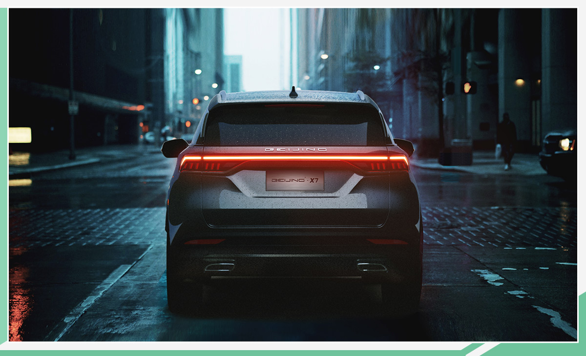 车尾部分,BEIJING-X7采用了时下流行的贯穿式尾灯组设计,并在下沿处加入镀铬饰条,与前大灯组相互呼应。此外,车尾下方还加入了镀铬饰条,大大提升了车尾的质感。