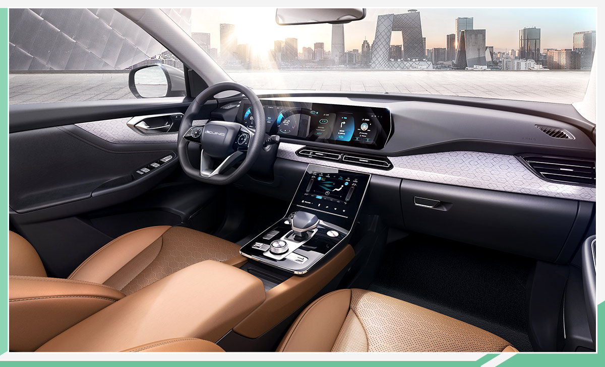 内饰方面,BEIJING-X7的整体内饰同样保留了概念车的设计风格,整体布局虽然简约,但却科技感十足。我们可以看到,新车并没有采用实体键,均为触控式按键,包括方向盘上的按键也设计成了触控式设计。值得一提的是,新车采用了时下流行的全液晶仪表/中控屏联屏的设计,同时,空调调节区域也配备有一块液晶屏,让整个内饰充满了浓郁的科技感。