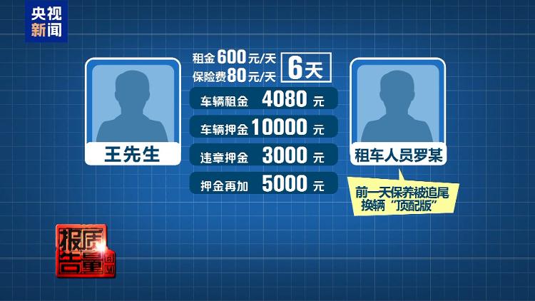 然而刚到取车地点情况就变了。租车人员罗某声称,原定车辆因前一天保养被追尾,临时换成一辆顶配版,押金需再加5000元。