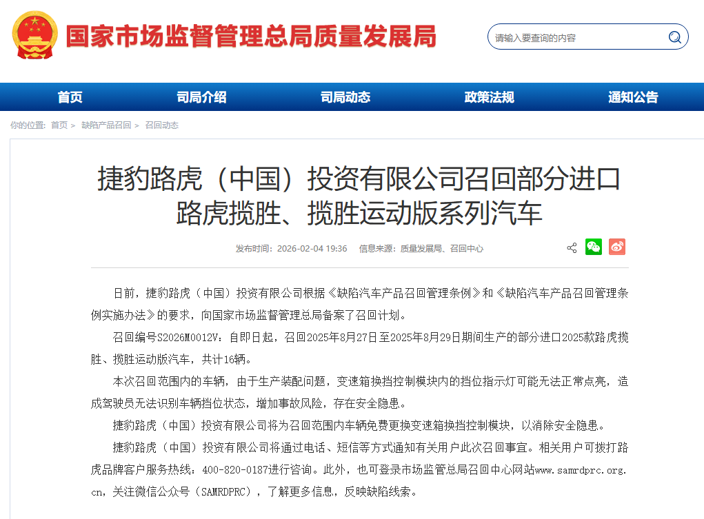 召回编号S2026M0012V:自即日起,召回2025年8月27日至2025年8月29日期间生产的部分进口2025款路虎揽胜、揽胜运动版汽车,共计16辆。