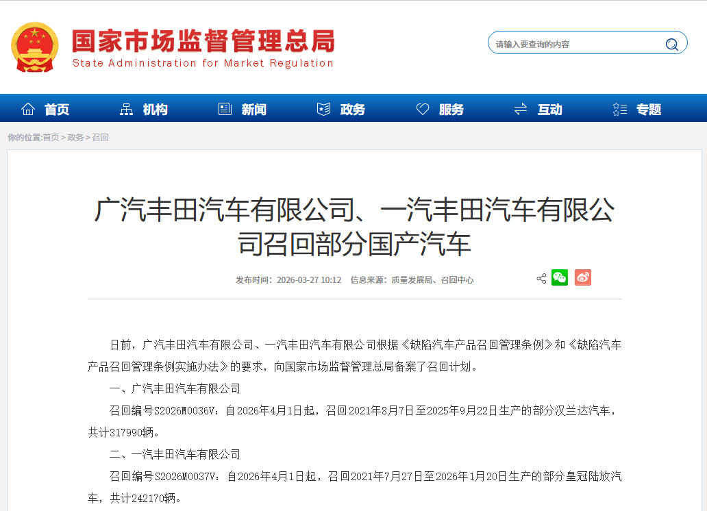 日前,广汽丰田汽车有限公司、一汽丰田汽车有限公司根据《缺陷汽车产品召回管理条例》和《缺陷汽车产品召回管理条例实施办法》的要求,向国家市场监督管理总局备案了召回计划。