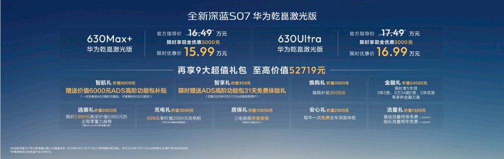 4月20日,全新深蓝S07华为乾崑激光版正式上市,带来630Max+华为乾崑激光版、630Ultra华为乾崑激光版两个配置版本。深蓝汽车推出5000元限时现金优惠,以及至高价值52719元的9大超值礼包,新车限时优惠价15.99万-16.99万元。尤其令人惊喜的是,价值6000元的ADS高阶功能包补贴。通过普惠价格+诚意权益,全新深蓝S07华为乾崑激光版真正兑现“普及全民智驾”使命,让更多人拥有顶流智能辅助驾驶体验。